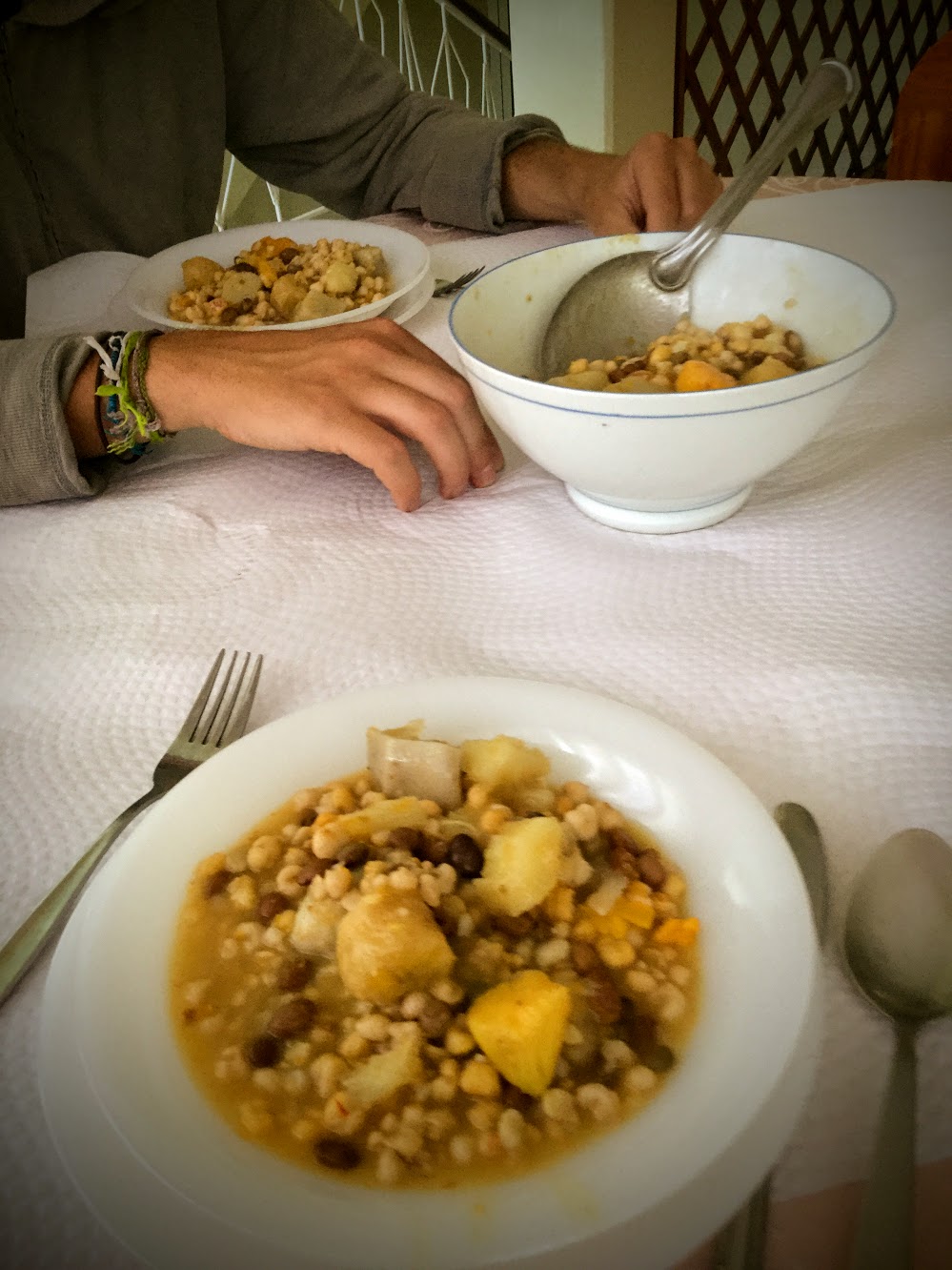 We came across a home with an arrow and sign indicating food if followed, while at the same time intersecting paths with a man overflowing with conversation and a tummy brimming with grogue. He swayed and slurred a bit here and there while slowly, yet also somehow boisterously, showing us with intermittent French anecdotes the way to the rooftop restaurant. The restaurant, which was was to be the backdrop for one of the most mouthwatering bowls of cachupa we would consume during the entirety of our time in Cabo Verde, was owned by the same family Grandma Georgina had guided us to. Along with the delicious cachupa — the Cabo Verdean national dish of root vegetables, beans and collosal corn kernels — we sipped glasses of white wine from the island of Fogo — one of the seven in the chain — that houses an active volcano and, in that, volcanic soils perfect for growing grapes.